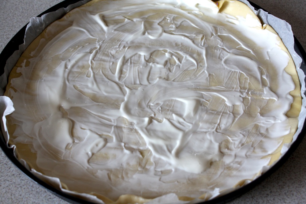 Stendete la pasta sfoglia nella teglia e copritela con un sottile strato di panna